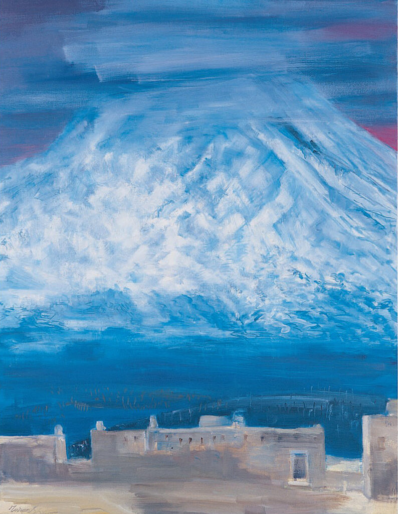 Dağ imgesiyle adeta içsel bir yoğunlaşmanın sonucu olarak buluşan Turan Erol, resmimizin boyasal nitelikle elde edilmiş en vurucu ve en etkili doğa yorumlarını serer gözlerimizin önüne… Yerel aidiyetleriyle ve kendiyle sınırlı kalmayan aşkın bir imge gerçekliği; bir görüntüye, doğa kesitine odaklanmayan aynı oranda pek çok dağ ve tepe’nin yarattığı duygulanımla eşdeğer bir alan ve gönderim zenginliği söz konusudur burada. Adı “Ağrı” olan dağ, bir süre sonra genel anlamda bütün ulu dağların temsili olan bir aşkın imgeye dönüşmüştür.